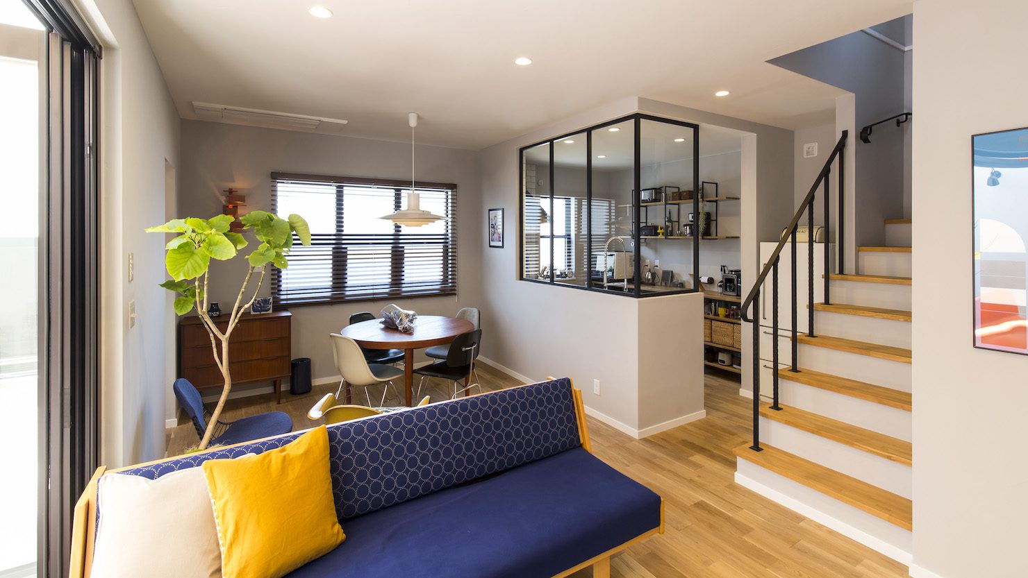 ミッドセンチュリーモダンに合うのはサッシが黒の窓。壁を引き締め家具の素材感を引き立ててくれます。