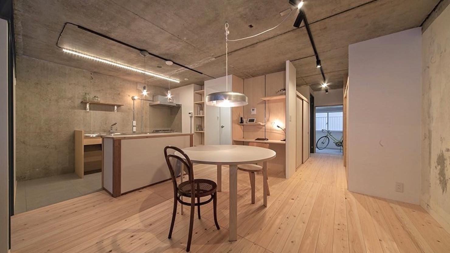 間伐材や地産地消の素材や残された建材を使うことで、廃材の少ないリノベーションを目指しました。内装はコンクリートの素地を生かし、これまで幾重にも張り替えられてきた壁紙の風合いを残しています。