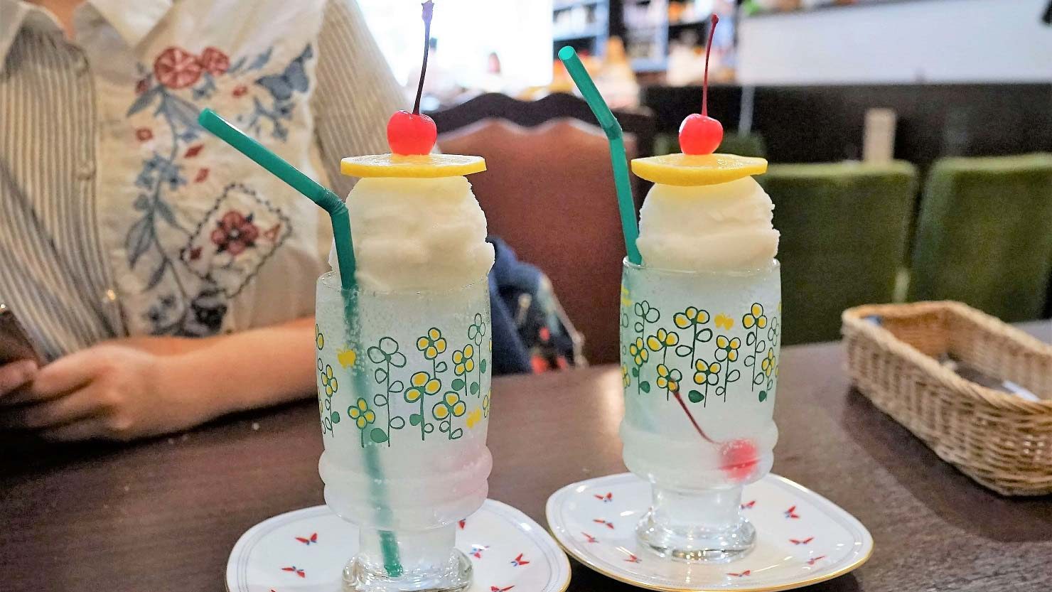 レモンスカッシュはレトロなグラスに森英恵のお皿、レモンとチェリーの盛りつけが何ともかわいく魅力的。レモンシャーベットがのっかっているので、最初から最後まで爽やかに楽しめ、夏の風物詩的メニューとなっています。まさに昔ながらの喫茶店が逆にインスタ映えになっている好例ですね。