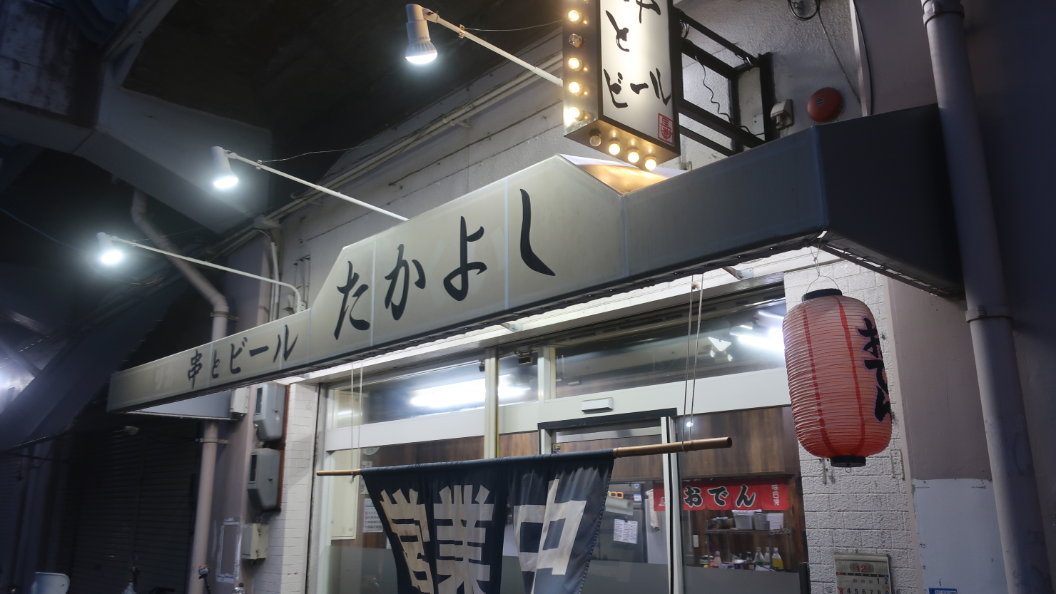 「奈良屋商店」を出て、鴫野駅の高架下エリアへ向かってみます。お酒が飲めそうな店がいくつかあった中で、「串とビール たかよし」の大きなのれんに惹かれ、入ってみることにしました。