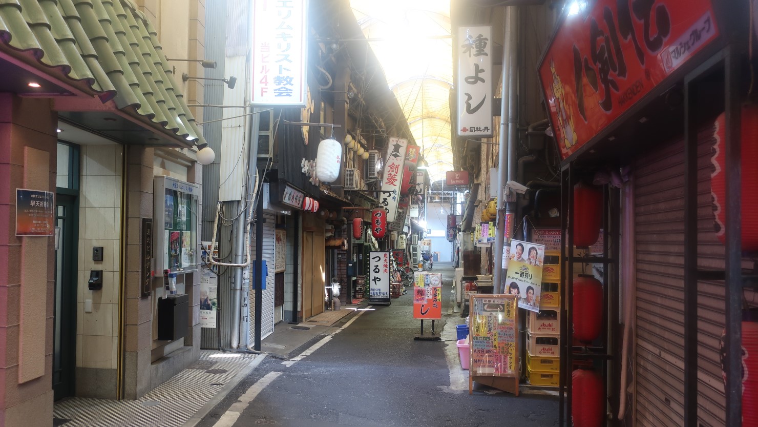 取材当日は夏の日差しが強く、てんしばの雰囲気だけ眺めてすぐ引き返し、公園の東にある阪和商店街のアーケードへ向かいました。昭和初期の雰囲気を今もそのまま残す商店街で、通り沿いには個人規模の飲食店が立ち並んでいます。有名店も多く、穴場のグルメスポット“裏天王寺”としても知られる一角です。