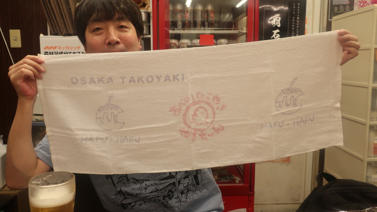 そんなことを懐かしく思い出し、「あべのたこやき やまちゃん2号店」のイートインスペースでたこ焼きを食べて行くことにしました。いろいろとあるたこ焼きの味付けの中から3種類が盛り合わせになった「渾身の三種盛り」をもらいつつ、編集部・Mさんと生ビールで乾杯します。やまちゃんのたこ焼き、中身がふわっとしていてやはり最高です。今まで食べたことのなかった「ごま油塩」も気に入りました。キャンペーン中とのことで、オリジナルのタオルもいただけてうれしかったです。