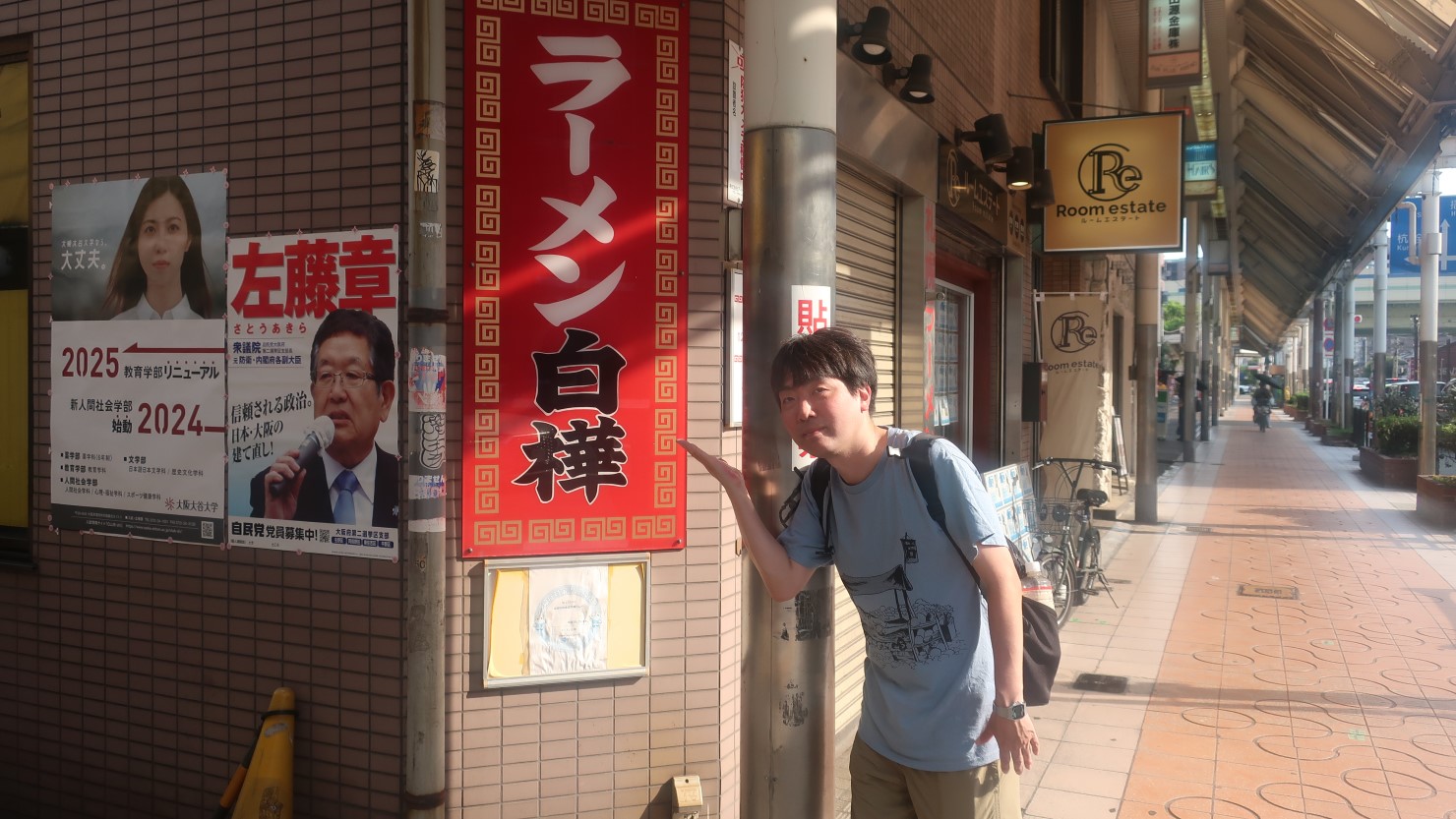 お店を出てさらに南側へ歩くと、徐々に住宅街らしい雰囲気になっていきます。昔ながらの住宅とマンションとが混在するエリアを進み、私がかつて取材でお世話になった職人さんの工房があった跡地を眺めました。そこは、受注した広告などに手書きで文字を入れる「字書き職人」の松井さんという方の工房で、残念ながらすでにその松井さんは亡くなってしまっていて、今は建物が残るだけになっています。しかし、そこからあべの筋の大通りに出ると、通り沿いに「ラーメン白樺」というラーメン店があり、今もその看板に松井さんの立派な文字を見ることができます。