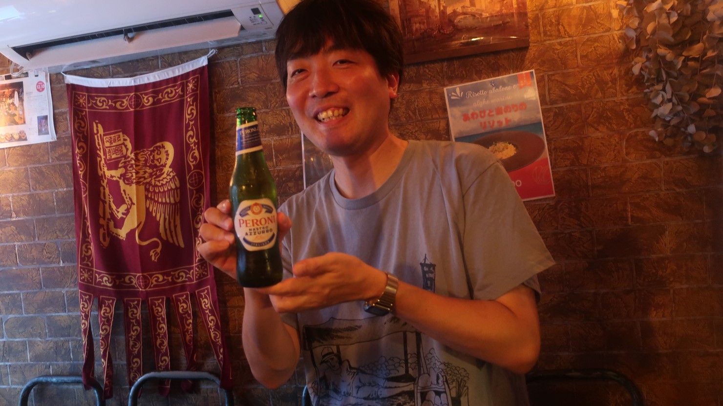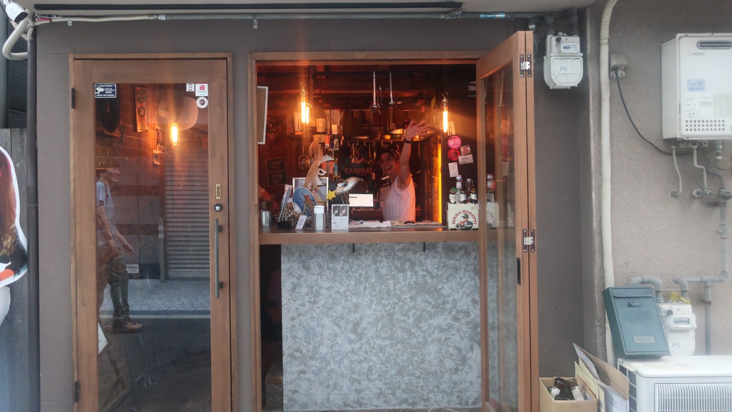 気さくなアレさんとの会話を楽しみながらのんびり飲んで行ける店で、すごくいい出会いでした。「また来ます」と外へ出て、店の前にあるアレさんの等身大パネルと一緒に記念撮影をしました。ちなみにこのパネル、アレさんが故郷のイタリアに2週間ほど帰った際、その間は別の方に任せていたお店に常連さんが来ても寂しくないようにと作ったものだそう。