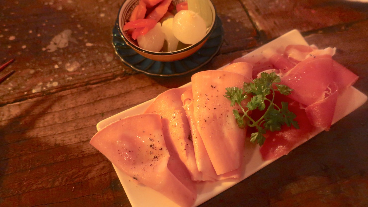 「でもそれは間違いなかった。大阪、イタリア人にすごく合う」と、我々がオーダーした生ハムをスライスしてくれながらアレさんは言います。「料理も美味しいし、一番大きいのは物価が安いことですね。住みやすい。阿倍野は路地にお店も増えてきたし、でも天王寺よりちょっと静か」と、大阪の印象も、阿倍野の印象も良いそうで、それをなんだかうれしく思います。