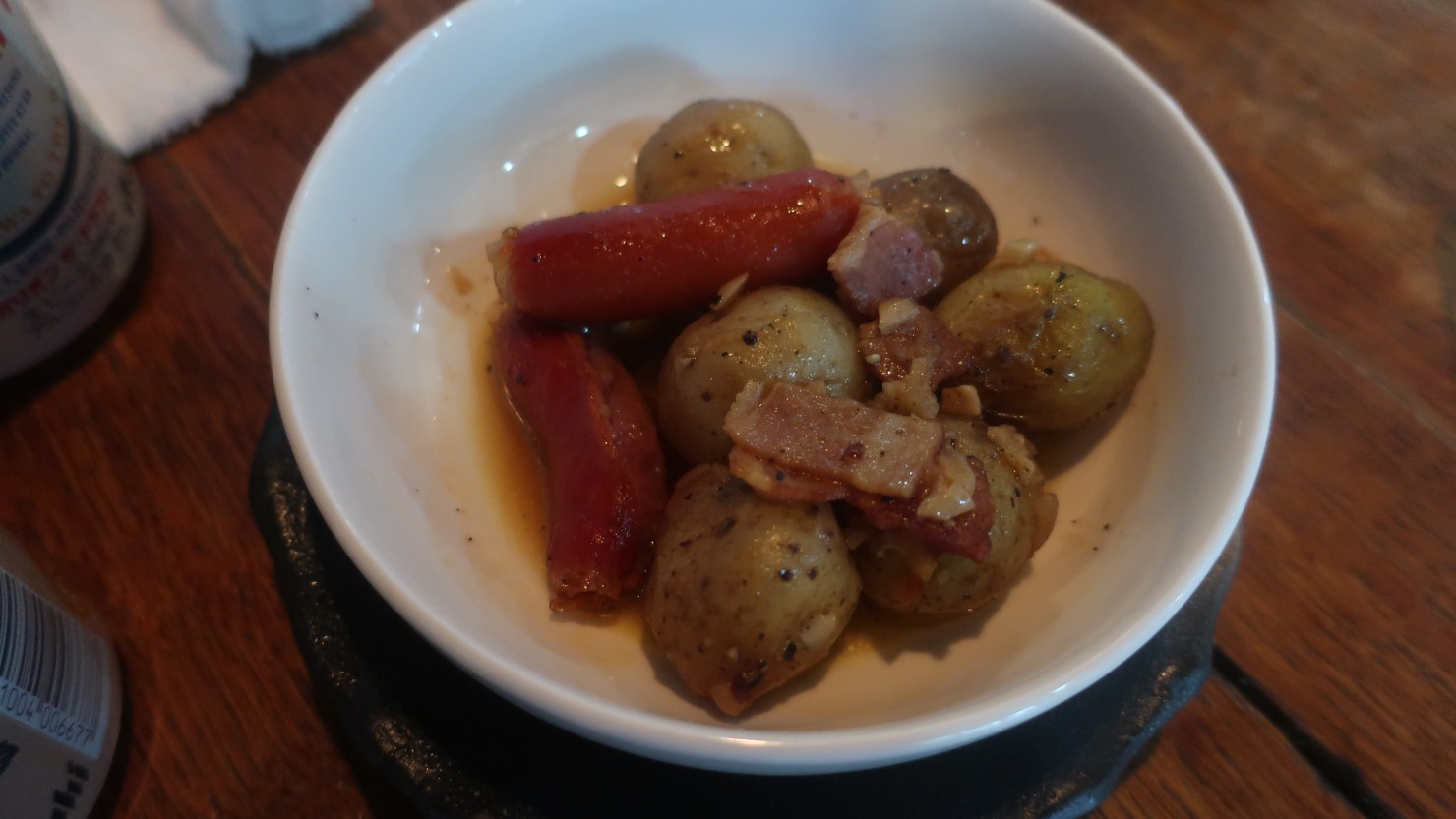 缶入りのオリオンビールを飲みつつ、大き目で食べごたえのある「カミナリしゅうまい」、ニンニクの効いた味わいとホクホク感がたまらない「新じゃがジャーマンポテト」をいただきます。日替わりメニューも豊富で、どれも300円台~400円台中心の嬉しい価格です。