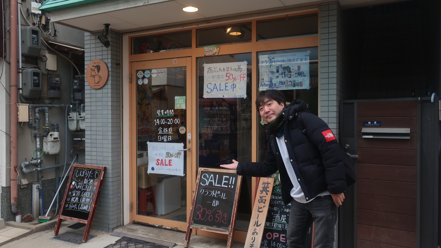 店主の梅原丈史さんにお話を伺うと、このお店はクラフトビールや輸入ビールを中心に扱うショップとして8年前にオープンしたそうです。丈史さんの祖父の代からこの地で酒屋を営んでこられたとのこと。かつては滝道の入り口に「梅原酒店」という酒屋があったそうで、「両親がそこで角打ちをしていたんです。大きなテーブルで知らない人と一緒に飲むような店で」と教えてくださるのを聞いて、私もかつてその「梅原酒店」に一度だけ飲みに行ったことがあったのを思い出しました。今はその店はなくなり、跡地は駐車場になっているそうですが、丈史さんがその意志を引き継ぎ、この店内でも手軽な価格でお酒が味わえるようになっています(お店にはかつての「梅原酒店」にかかっていた立派な木製の看板が飾られています)。