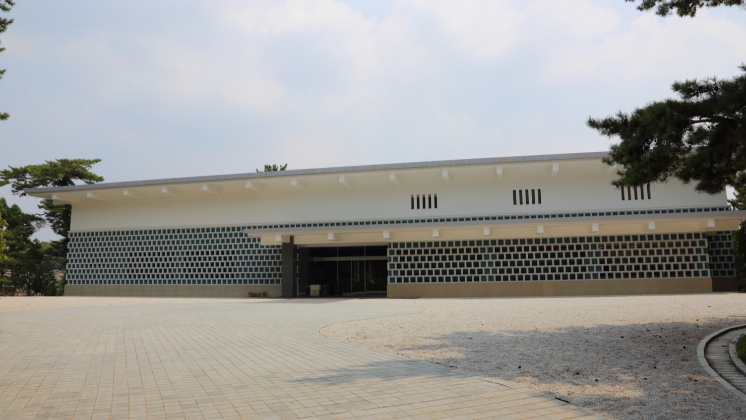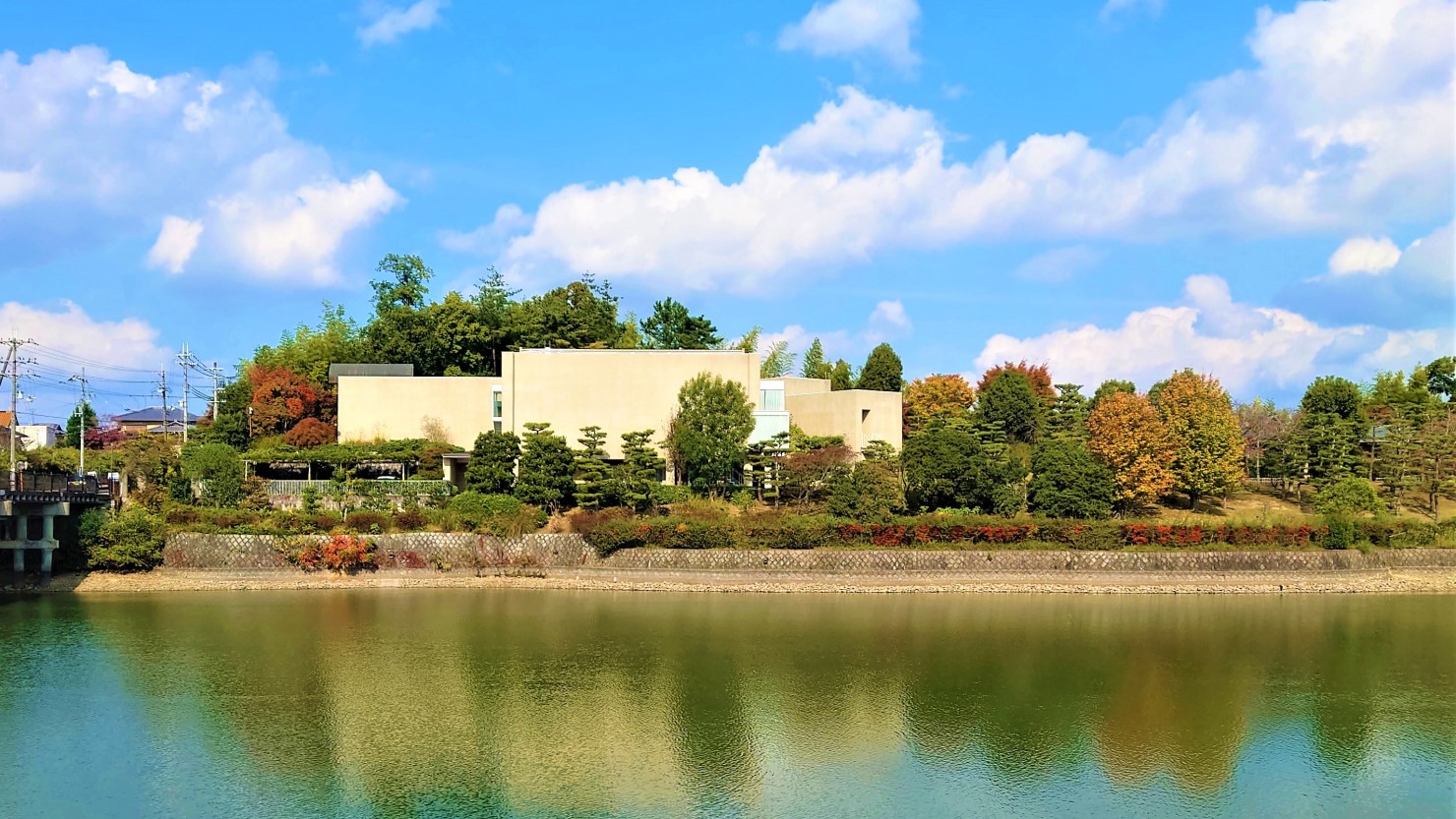 駅から車で5分ほどのところにある「松伯美術館」は、日本画家の上村松篁(しょうこう)と上村淳之からの寄贈作品と近鉄からの出資を受け、1994(平成6)年に開館。上村松園、松篁、淳之の三世代にわたる作品や草稿、写生などを展示することで三代の画業を知ってもらうことを目的としています。大渕池に面した敷地内には、四季折々に美しく趣を変える自然豊かな庭園が広がっています。