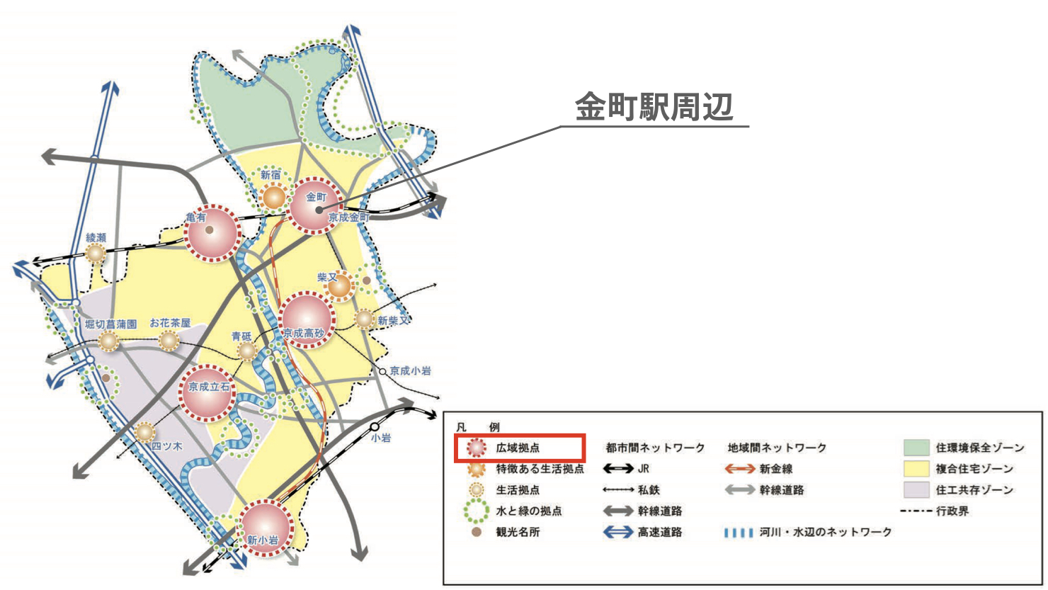 その中でも、金町駅は、行政計画上、区の北部の拠点に位置づけられています。