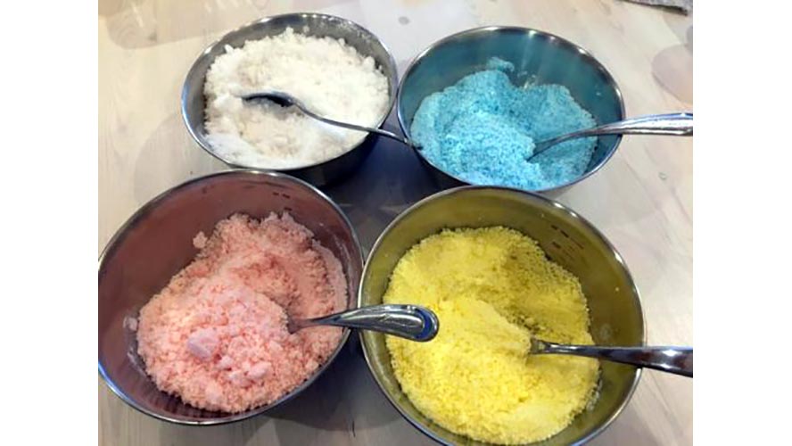 ② 食紅で色を付けます。白、赤、黄、青の4色があれば、いろいろな色ができます。