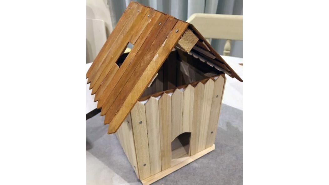 ④ 屋根と屋根のつなぎの部分をしっかりさせるため、角材と釘を使います。土台を作って、家本体とくっつければ完成です。