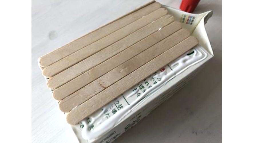 高さを調節した牛乳パックか、小さいサイズの牛乳パックを使用します。牛乳パックの側面の高さを木製スティックの長さに合わせておくと、カットせずにそのまま貼り付けられます。