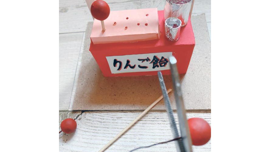 こちらは、お祭りの屋台のミニチュア作品。「りんご飴やわたあめに使う材料は何がいいかな?」「似ている形、素材のものは何があるかな?」と、材料探しから工夫したり調べたり。お手軽なキットも売られていますが、お菓子の空き箱や折り紙、爪楊枝など、わが家では家にあるもので工夫して作る体験がとても楽しそうでした。