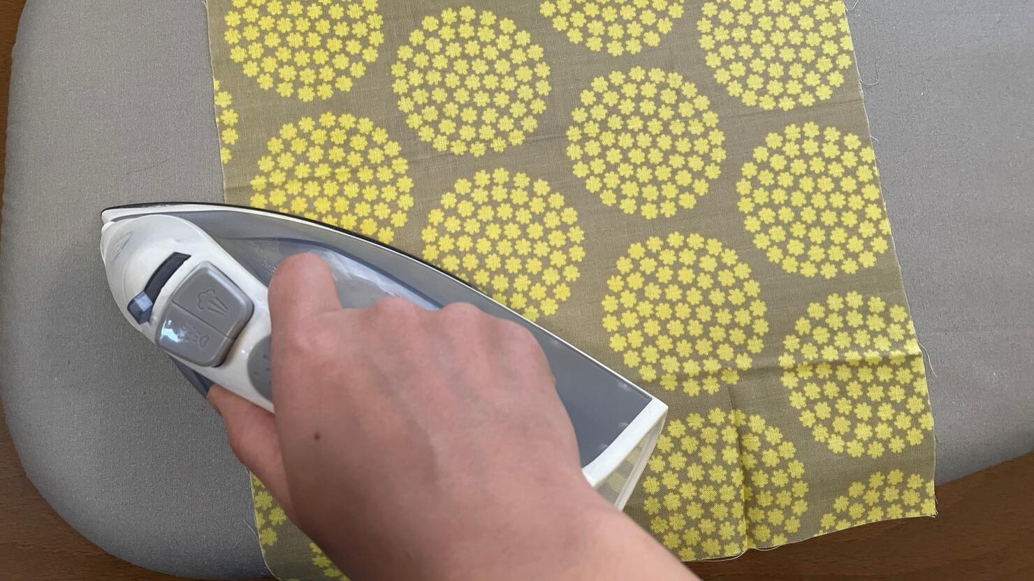 縫う前の最後の工程です。ここでも一度アイロンを当てましょう。余計なシワなどを整えるとともに、2枚の布がかみ合わさって滑りにくくなります。