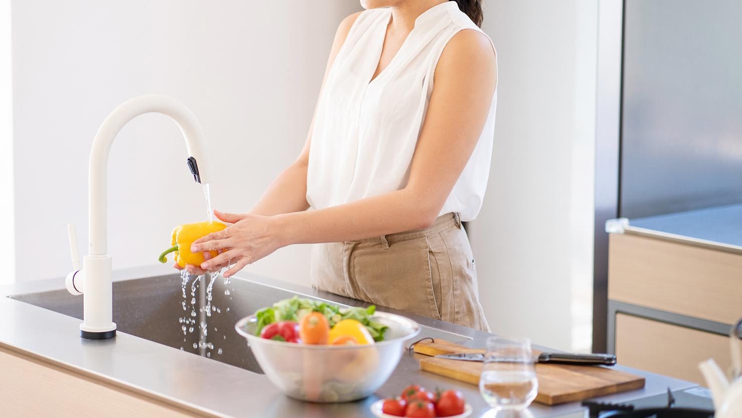ディスポーザーというと、「大きな音を立て、水をずっと流していなくてはならない」というイメージの方もいるのではないでしょうか。実際、ディスポーザーを使用するには流水が必要ですが、粉砕をしている時間とその後の数十秒の間だけです。