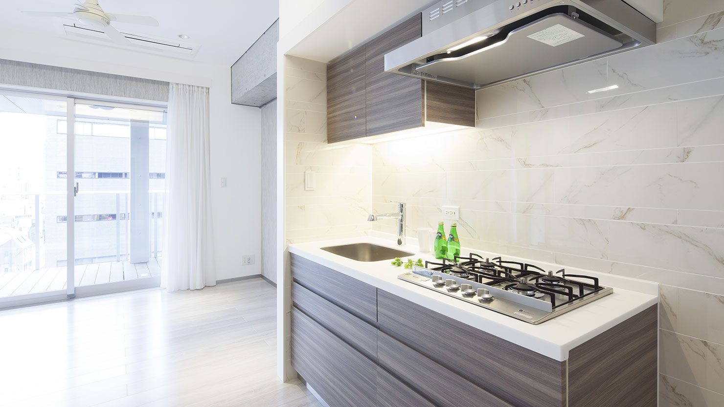 壁付けキッチンには、シンク・調理台・ガス台が一直線に並んでいるタイプと、キッチンの角に沿ってL字に配列してあるタイプがあり、いずれのタイプも家事動線の短縮が可能です。
