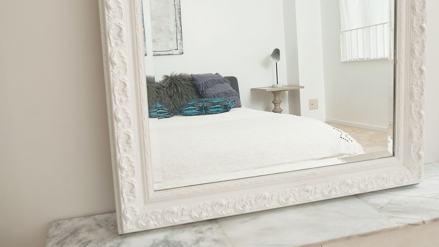 さらに、お部屋を広く見せるために効果的なインテリアは、ミラーです。壁面や部屋の角にミラーをかけたり置いたりすることで、空間に奥行きを演出し、空間の広がりや明るさを感じさせる効果があります。