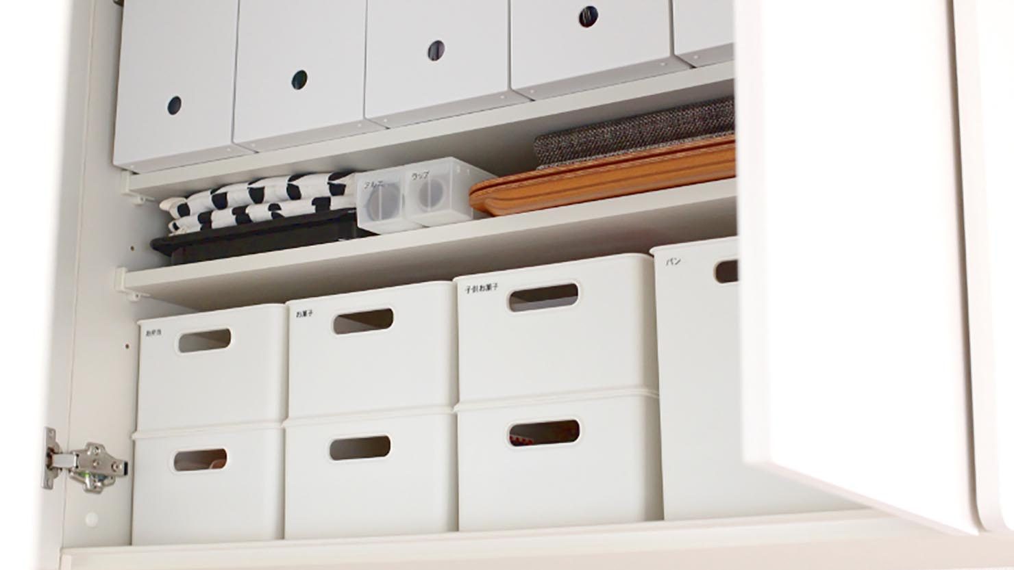 ただし、吊戸棚の場合は、そのままモノを棚に直接並べて置くと奥のモノが取り出しにくくなってしまいます。吊戸棚では持ち手付きのボックスなどを使って引き出しやすい工夫をしておくと、奥の空間まで有効活用できます。