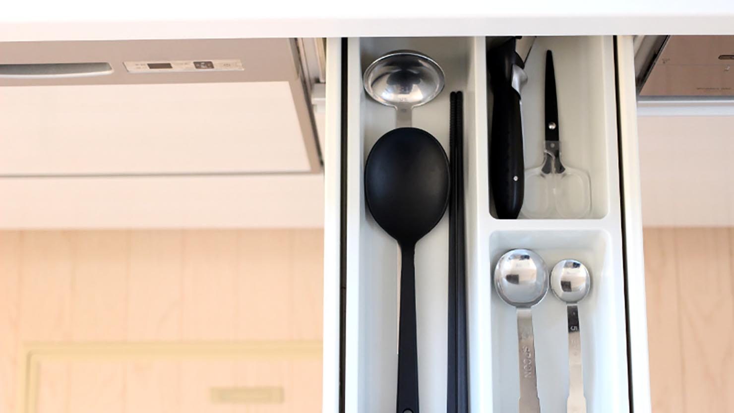 そのようなときは、使用頻度でキッチンツールを分けてみましょう。お玉や菜箸、大さじ小さじなど、毎日のように使うものは、一軍のキッチンツールとしてコンロ脇の引き出しに収納します。