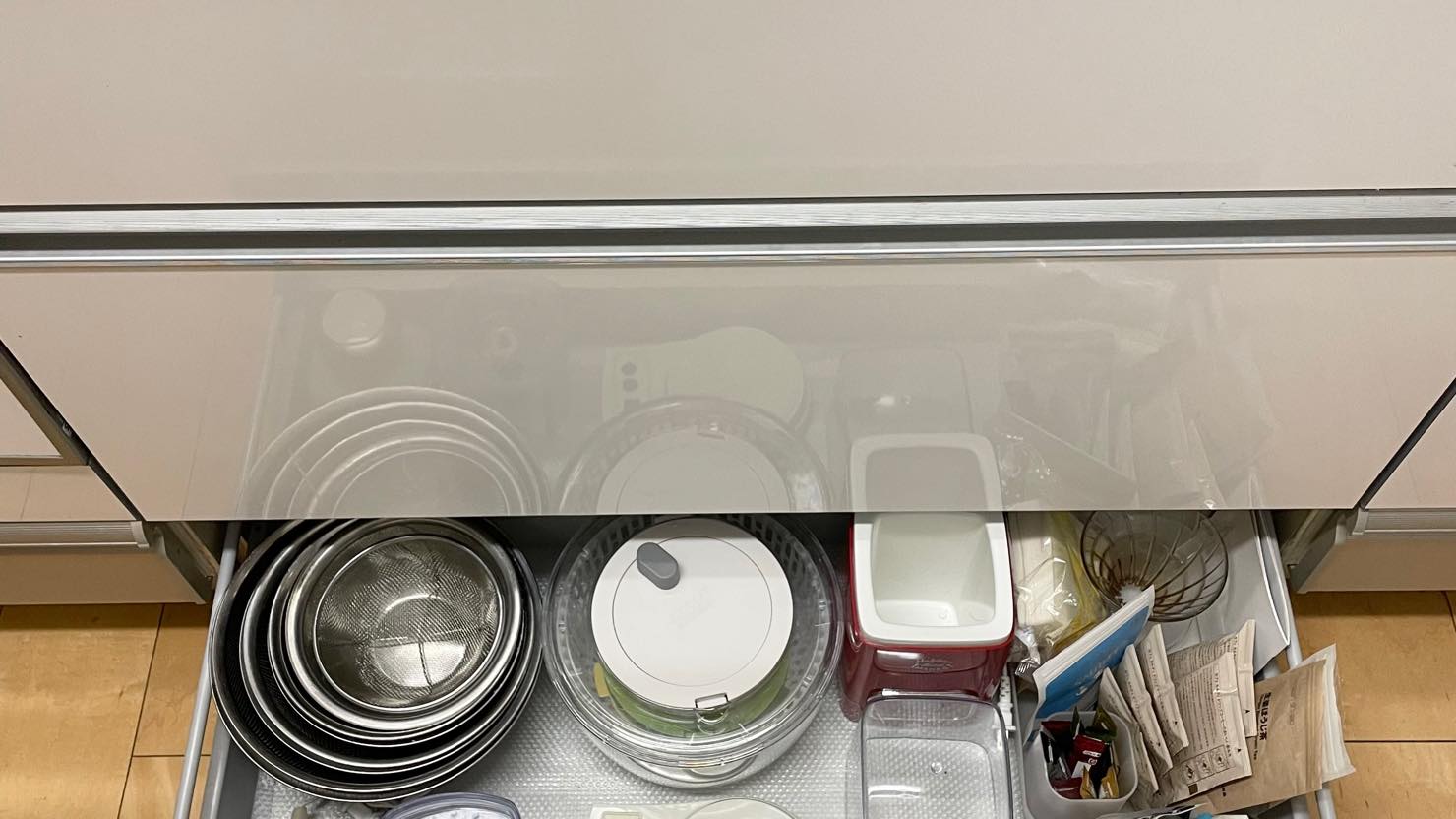 わが家では、サラダを作る際にサラダスピナーを使って水切りをするのですが、これがなかなか幅をとるのです。また、頻繁に使うため、出しっぱなしにしてしまうこともありました。そこで、シンク下の収納スペースにしまうようにしたところ、出し入れがしやすくなり、こまめに片付けられるようになりました。