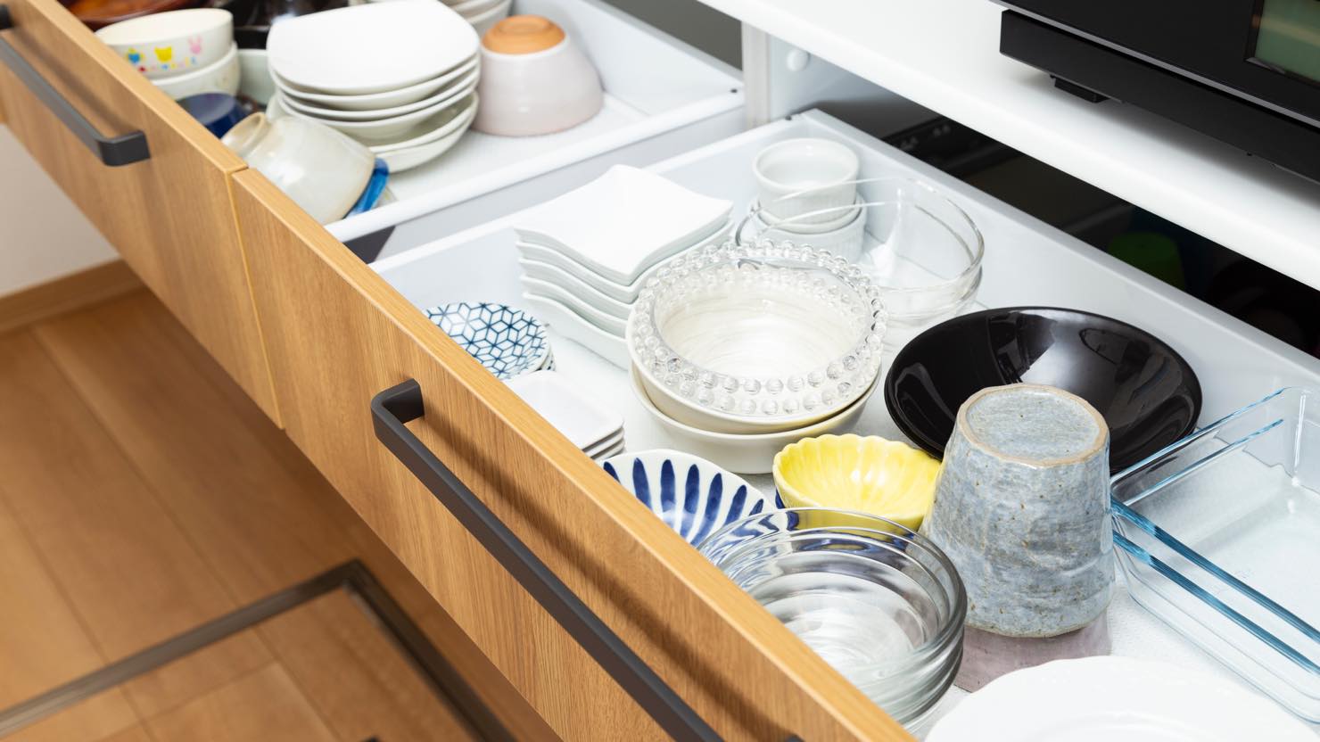 システムキッチンの下段収納 下段収納は、引き出し収納になっていることが多いです。そのため、上から全体を見渡せるような収納にすると探しやすく、出し入れもしやすいですよ。下段の引き出し収納を有効活用するには、高さのあるモノ、重ねて収納できるモノを入れるとよいでしょう。 また、平皿など厚みの少ないアイテムは、引き出し収納の中に「立てて収納」すると使いやすくなります。書類ケースなどに入れて並べると上から見やすく、取り出しやすいですよ。お皿を上下に重ねずに収納できるので、割れにくくなります。