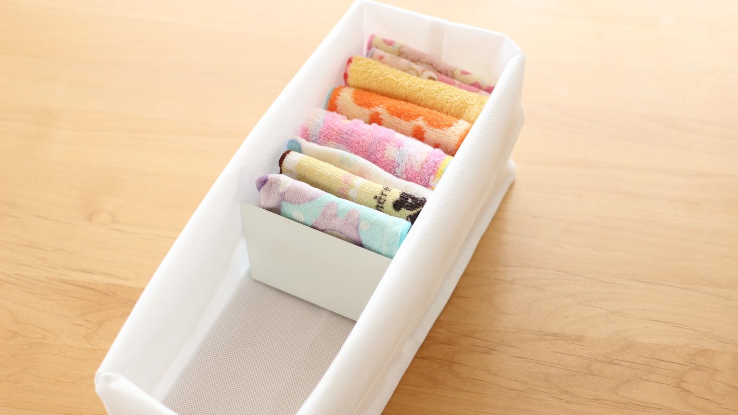 ハンカチサイズ・靴下サイズなどいくつかサイズ展開があり、ごちゃごちゃしやすい小物をすっきりと立てて収納することができます。立てることで中身が見渡しやすく、選びやすくなるのでオススメですよ。