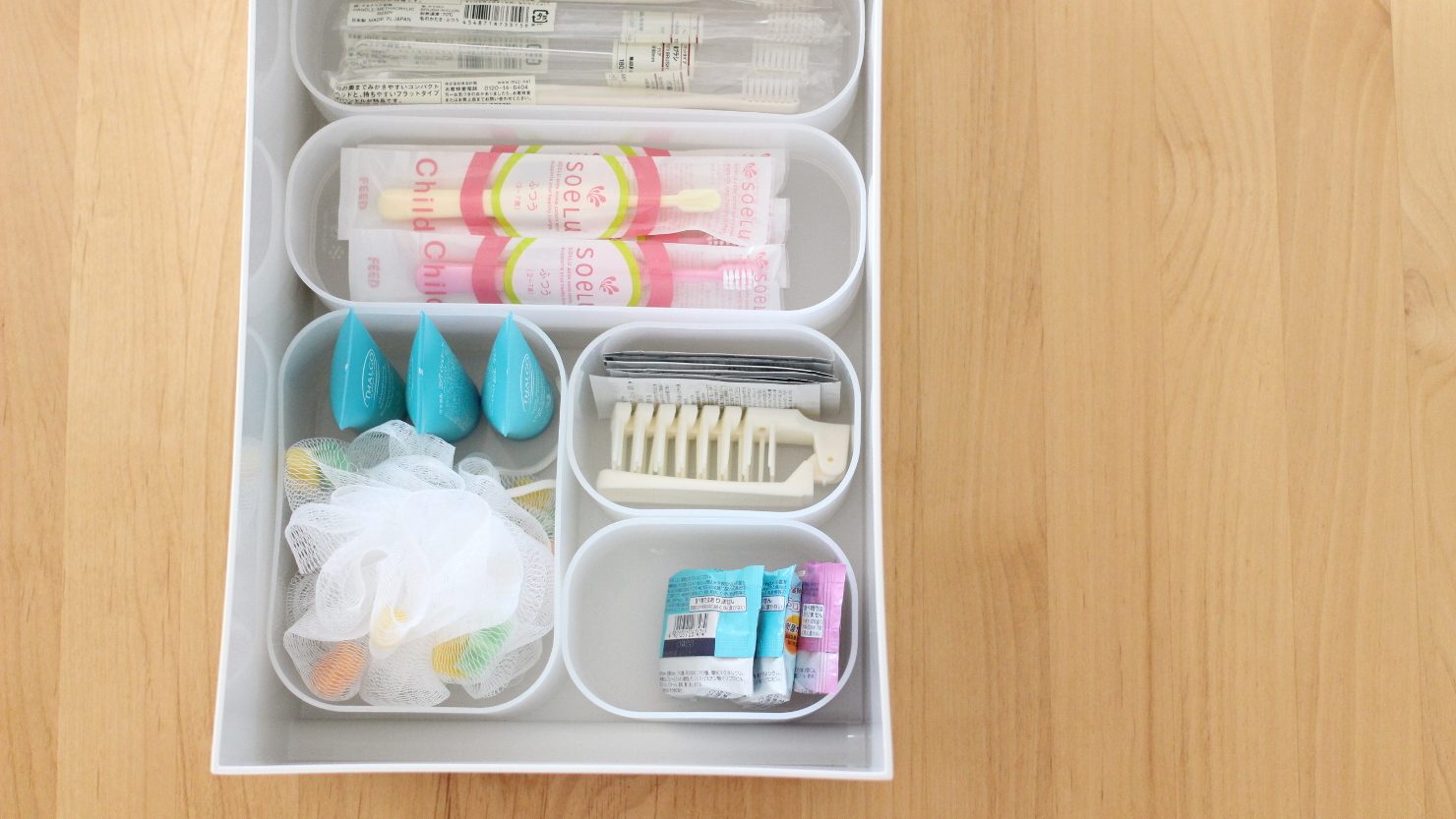 前述のキッチン引き出し収納でも述べていたように、レトルト食品などが不思議とぴったり収まるサイズで、それ以外にも子どもの小さなふりかけや、歯ブラシなどの生活用品を入れておくのにもちょうどよく、家じゅうのあちこちで幅広く使えます。