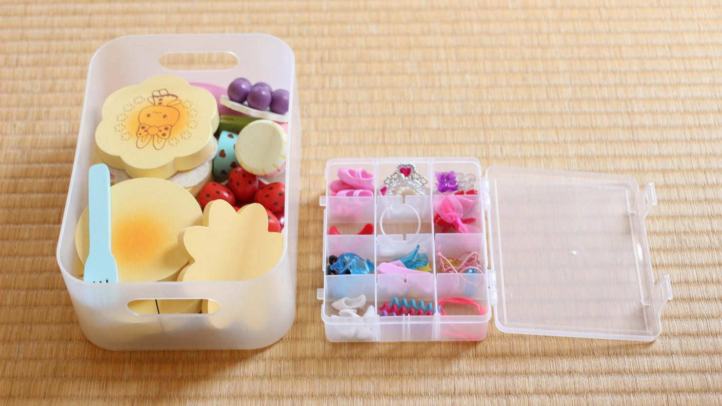 また、ダイソーやセリアには仕切り付きのボックスもそろっているので、細かいおもちゃを分類して整理するのに重宝します。