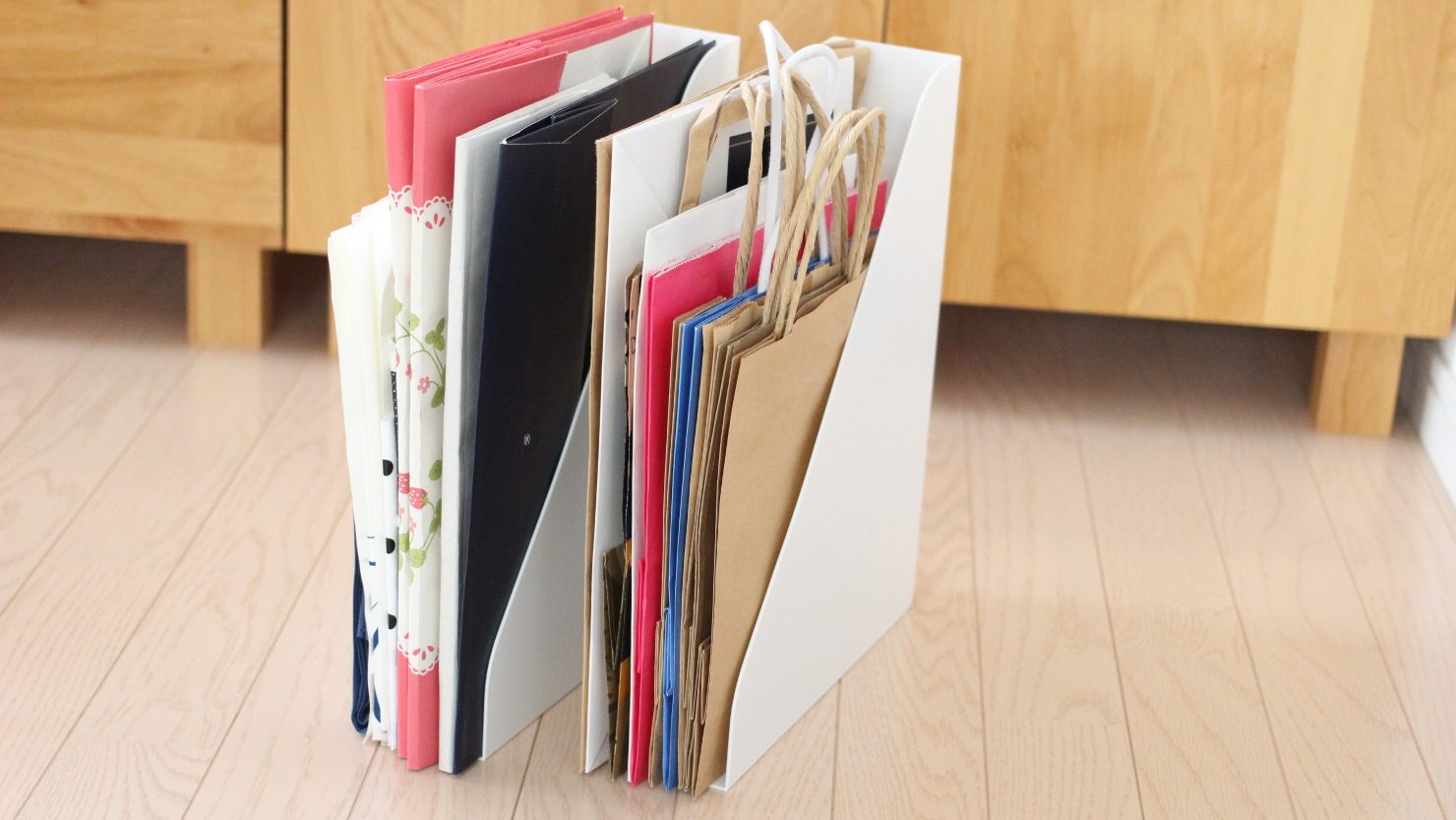 一般的なファイルボックスと違い、前面に立ち上がりがないのが特徴で、立てたものを取り出す時に、中身を持ち上げなくてもそのまま前にスッと引き出すことができます。なので、中身の出し入れがぐっとラクに! 紙袋を立てたり、ハンガーを立てて収納したりするのに便利です。