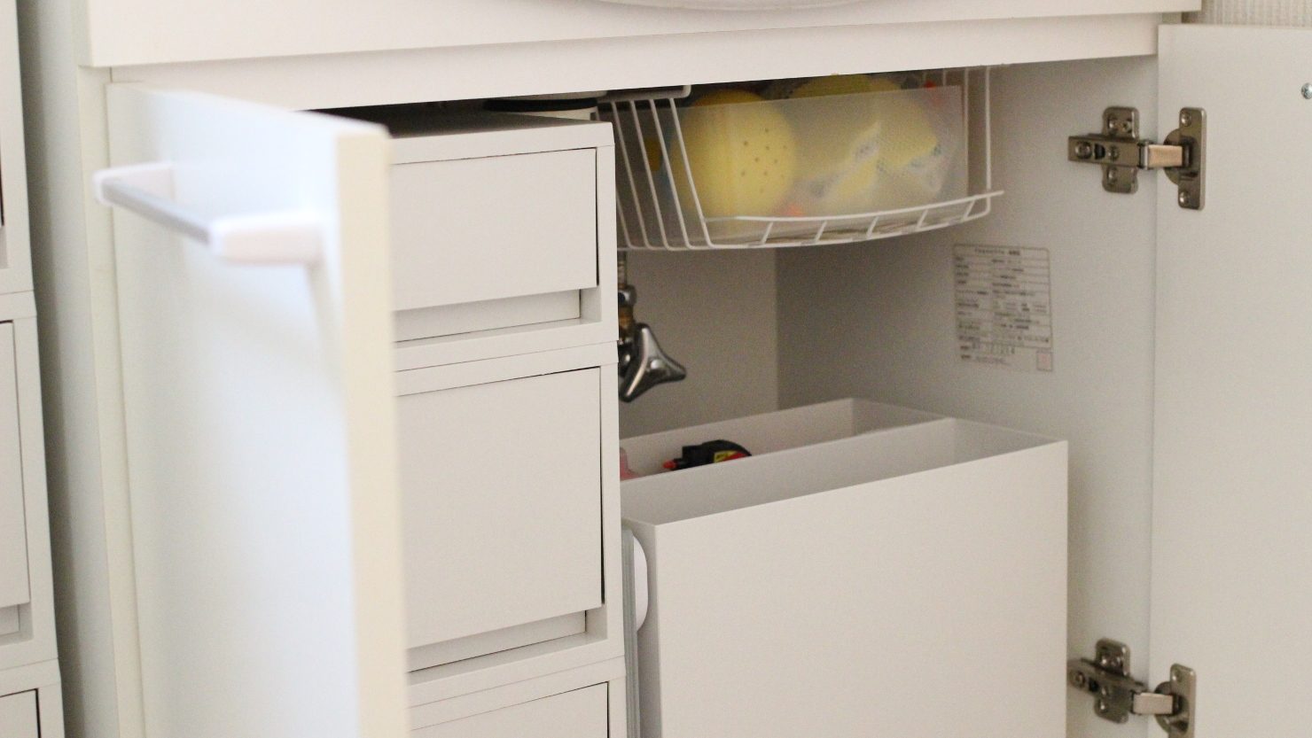わが家の洗面台下の収納は観音開きタイプで、引き出しやファイルボックスなどを使って整理しています。が、奥の配管の都合で、右側のファイルボックス上の空間が生かせず余ってしまっている状態でした。