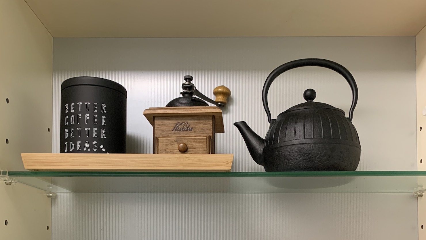 飾り棚付きのキッチンでは、お気に入りの鉄瓶やコーヒーミルを見せながら収納しています。