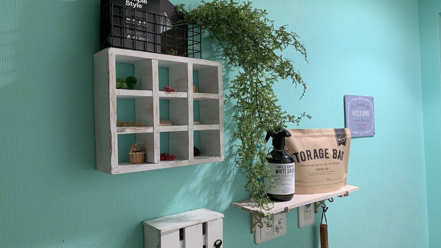 我が家では、玄関の電気スイッチの上に飾り棚を設置して電源スイッチの生活感をカバー。さらにその上に見た目の好きなクラフトバッグを置き、中に「マスク」を収納しています。