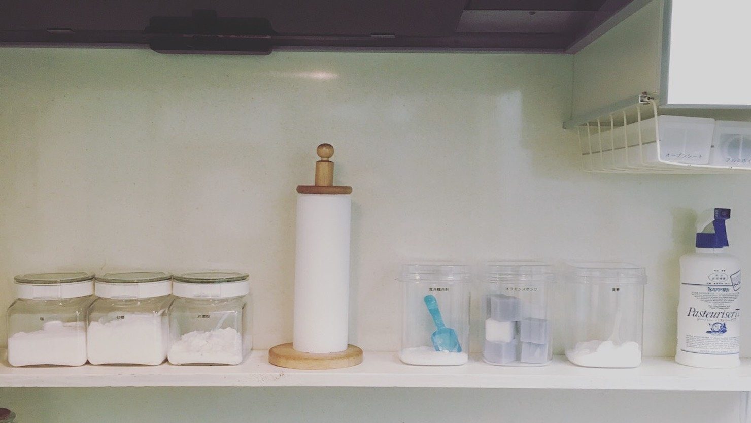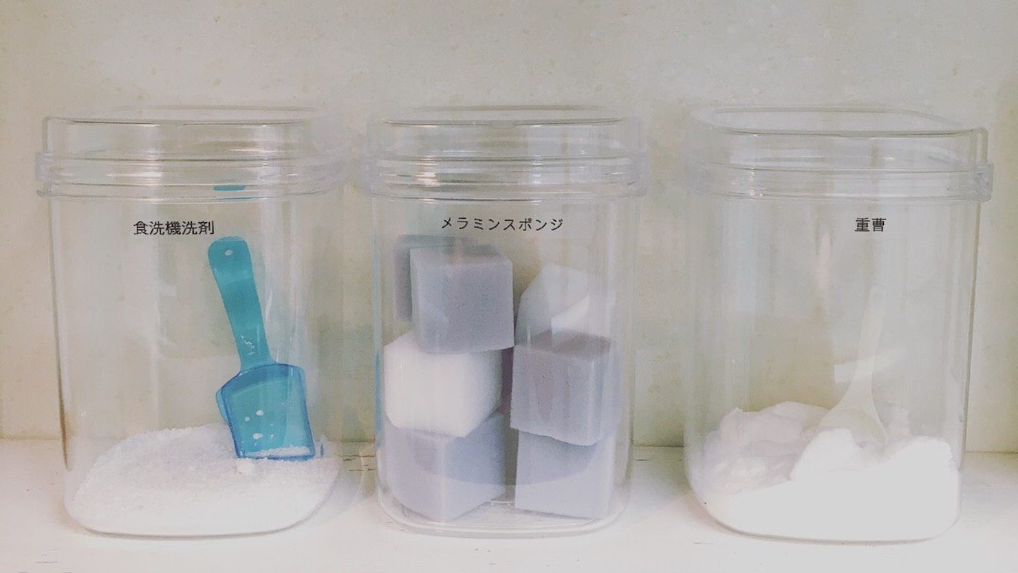 見せる収納実例:食洗機前の棚に容器をそろえた洗剤や重曹を置く