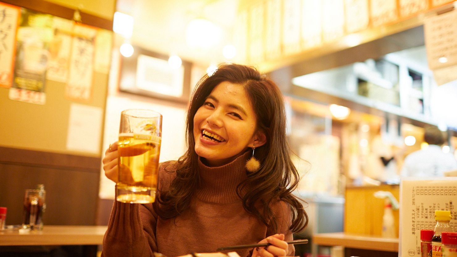 やってきたのは、「大衆酒場 晩杯屋(ばんぱいや) 下北沢店」。壁一面に貼られたメニューに目を向けると、どれもお手頃な価格帯。畑さんは慣れた様子でビールと数品の肴を注文し、いざ乾杯。現在24歳の彼女が居酒屋デビューしたのは、上京をした20歳のころにモデル仲間と一緒に訪れたときでした。