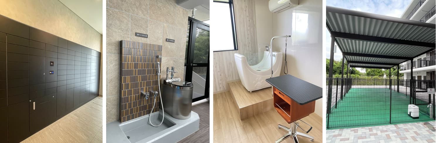 左:ノンタッチキーで開くメールボックス 左中:ペット専用足洗い場 右中:トリミングルーム 右:ドッグランはマンションの1階に1か所と、駐車場に隣接した敷地に2か所の合計3か所。マンション1階のドッグランは屋根付きで、雨の日でも運動できます