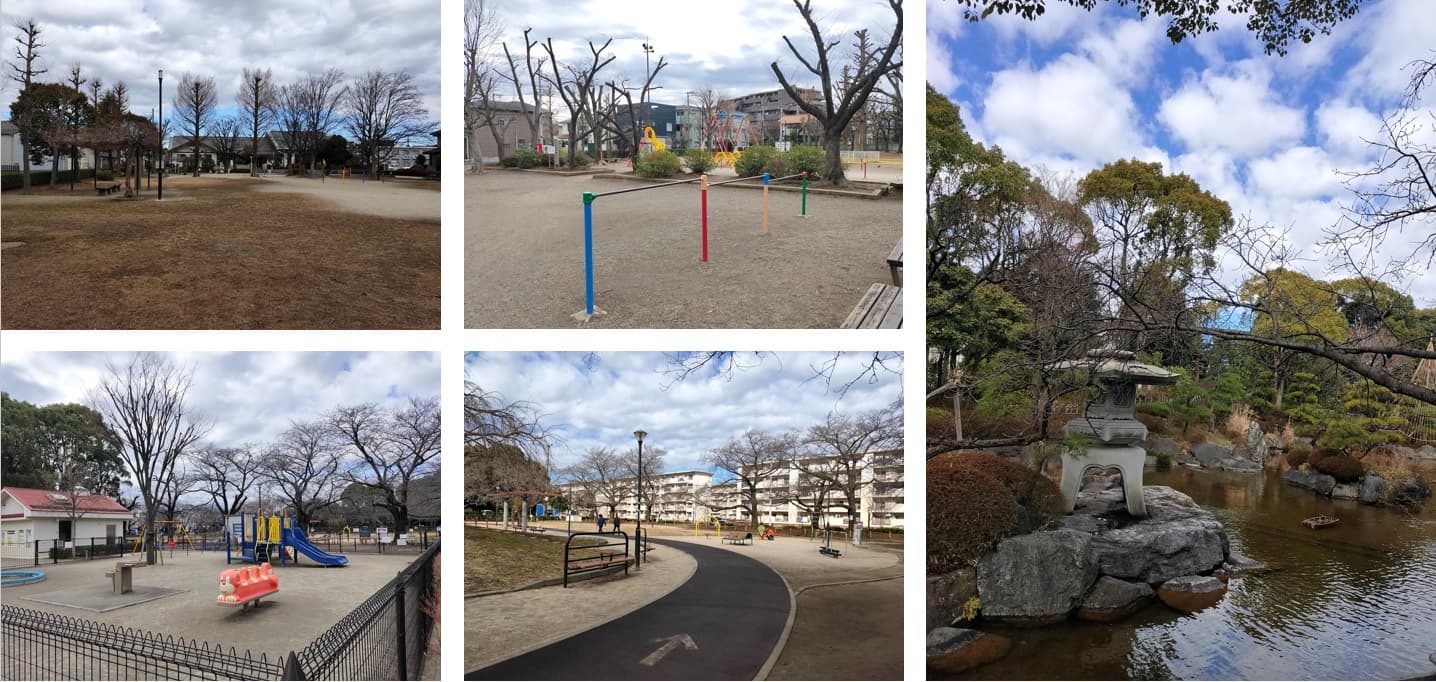 左上:「瀬崎山王公園」からマンション建設中のクレーンが見えました。上層階からだと、公園の子どもたちを見ることができそうな近さです 中上:「瀬崎角田公園」はきれいで遊びやすそうでした 左下:「花畑公園」には、幼児専用の公園がありました。子どもがまだよちよち歩きのときでも、安全に遊ばせることができます 中下:「花畑公園」にはウォーキングコースがあり、見学時もたくさんの人が運動していました 右:「花畑記念庭園」にはベンチがあったので、天気のいい日は、日本庭園を眺めながらゆったりとした時間を過ごしたいと思いました