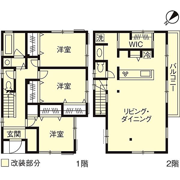 LDKと寝室に仕切られていた2階は、間仕切りをなくして一つのLDKに。キッチンの裏には大容量のウォークインクロゼットを造作。右のバルコニー側は書斎スペース。左は洗面室や洗濯機置き場の水まわり。キッチンを中心に、水まわり、収納と回遊できる動線となっている。
