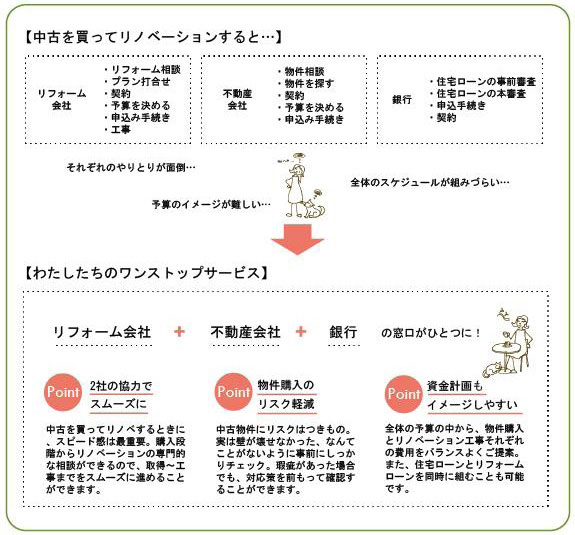 言うなれば、これまで不動産会社・銀行・リフォーム会社とバラバラに相談していたことが、一度にできるので手間が大きく省けます。