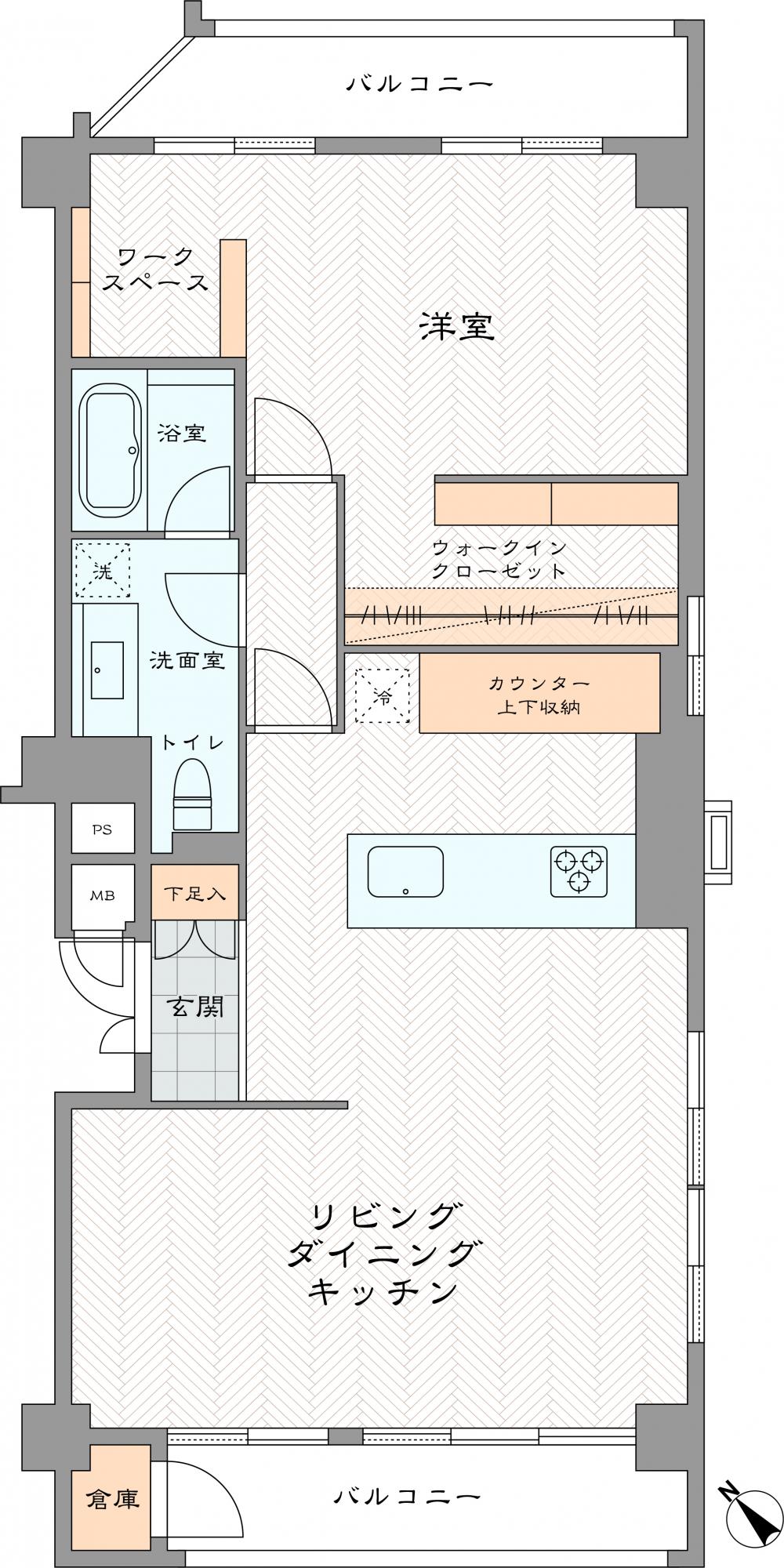 床全体にヘリンボーンを施しました。廊下や寝室まで継ぎ目のない一体感のあるフローリングが、空間により一層一体感をもたらします。