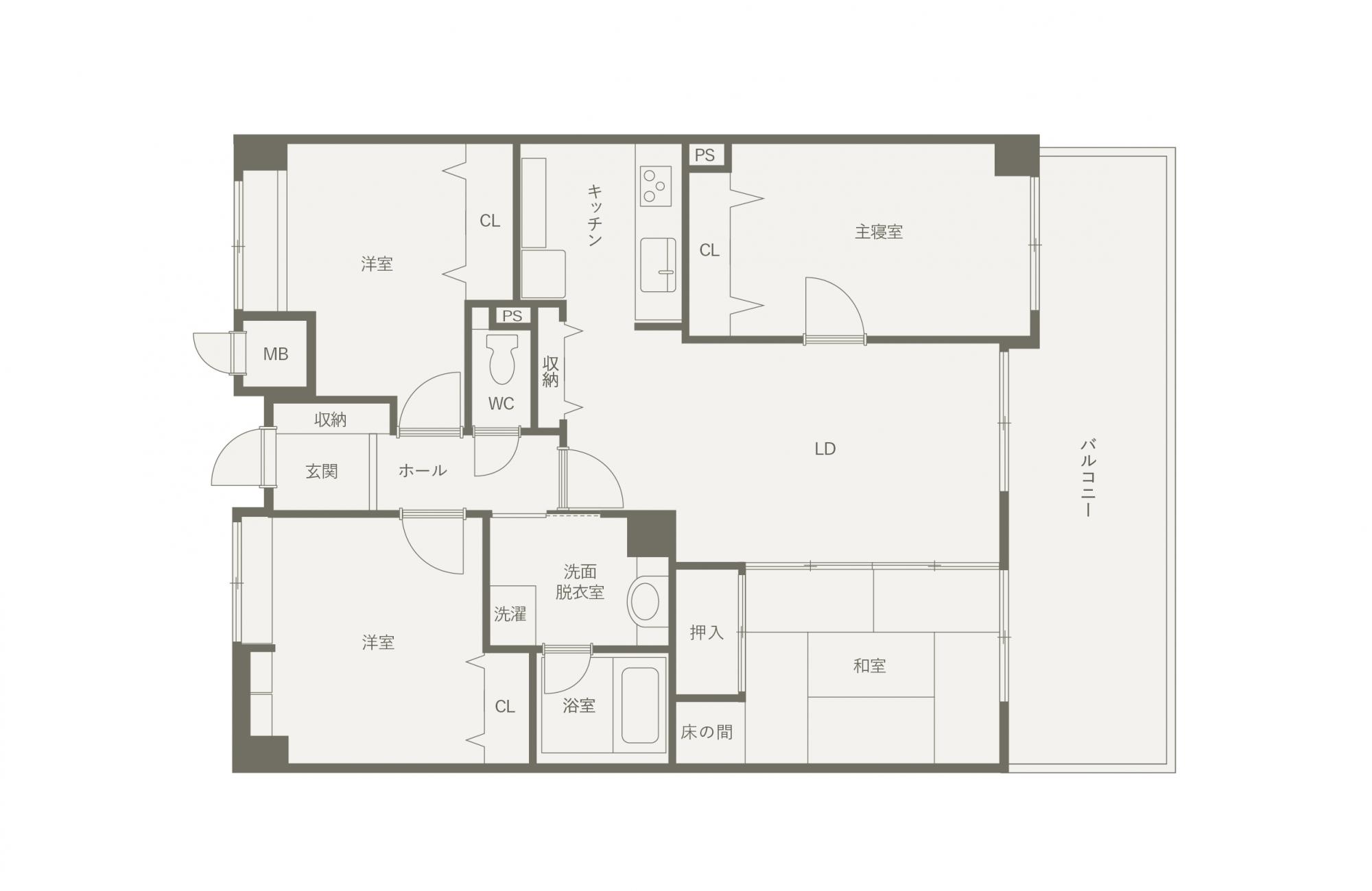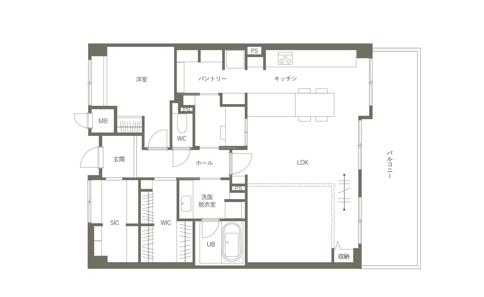 キッチンとダイニングを横並びに置けるように、Ⅱ型のべトングレーキッチンを選定。