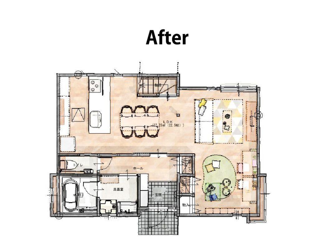 写真右側のドアは階段への登り口です。登り始めの位置を変えることですっきり広い形を実現できました。引戸を付けることで冷暖房の効率もアップします。