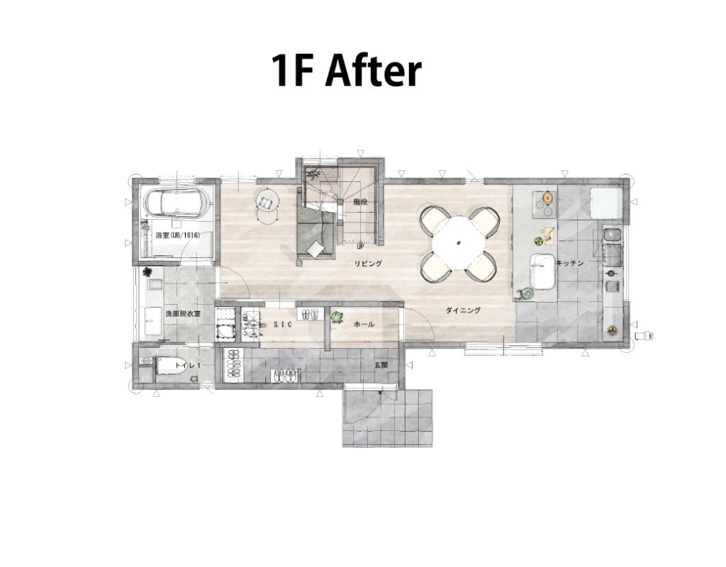 1階全体をLDKにしたので、壁付けから対面キッチンにレイアウト変更してもゆったりくつろげます。