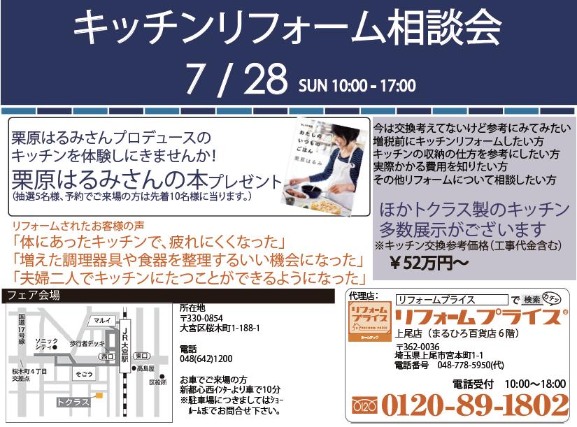 | 開催日 | 7月28日(土)会場:トクラス大宮ショールーム ※ご希望の日時をご予約時にお知らせください。 | ||