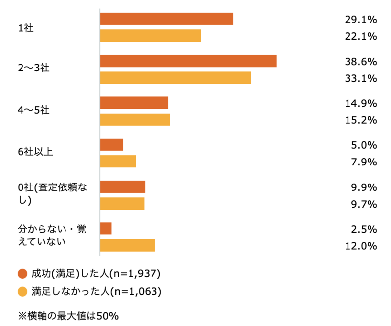 売却に成功した人の査定依頼者数は、「2〜3社」の38.6%が最多でした。この結果は、売却に満足しなかった人と比較しても、大きな差はありません。