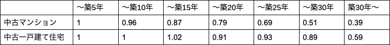 これらのデータをもとに「〜築5年」の価格を「1」として考えると、築年数ごとの価格推移は以下のようになります。