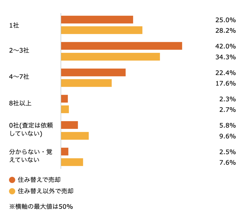 また、1社のみと回答した人は25%で、住み替え以外の売却よりもやや低めです。4〜7社と答えた人は約22.4%で、住み替え以外の売却よりやや多い数値となっています。