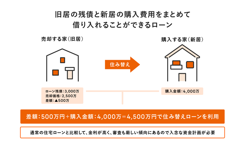 1つ目は、住み替えローンを借入れる方法です。住み替えローンとは、現在住んでいるマイホームを売却しても住宅ローンの残債があるときに利用されるローンです。