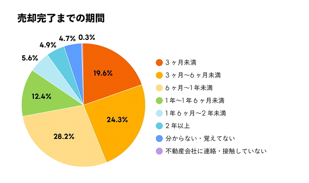 上図を見ると、6ヶ月〜1年未満で売却できた人が28.2%で最も多く、次いで3ヶ月〜6ヶ月未満で売却できた人が24.3%でした。一方、22.9%の人は売却完了までに1年以上かかっているため、長期化する可能性があることも理解しておく必要があります。