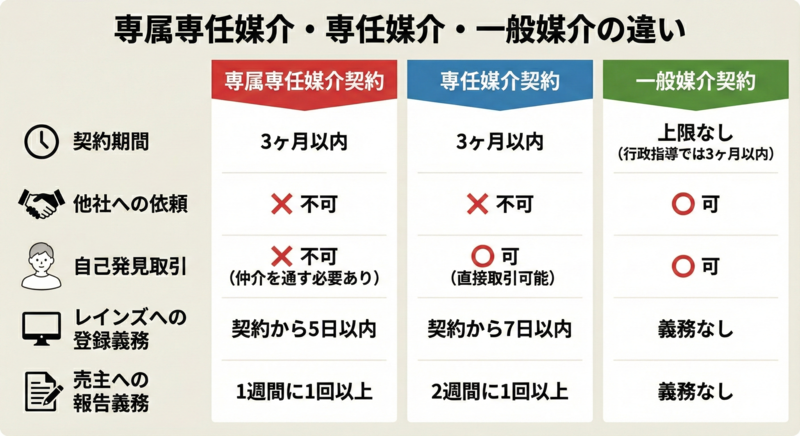| 項目 | 専属専任媒介契約 | 専任媒介契約 | 一般媒介契約 |