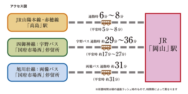 最寄りの高島駅からは岡山駅まで2駅と、電車による通勤・通学にも便利なエリアです。